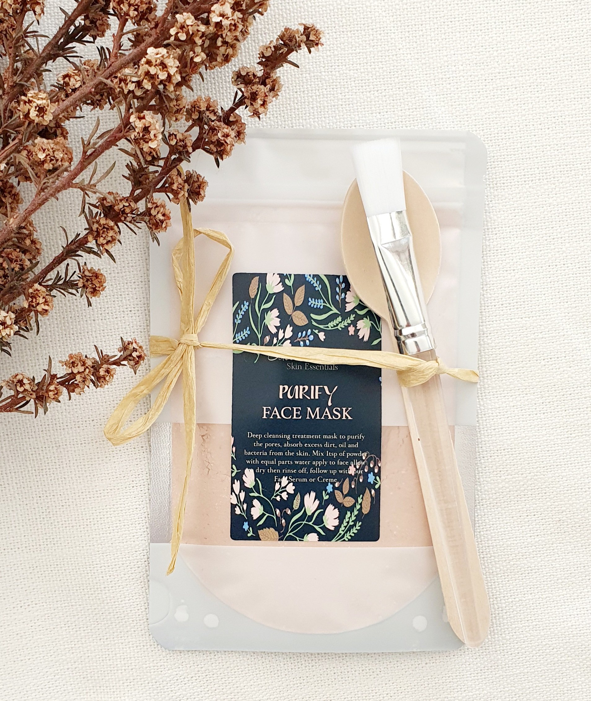 Mix 1 teaspoon of dry powder with ½ teaspoon purified water (add a pump of facial serum for dry skin) to create a thick paste. Apply evenly to face and neck.